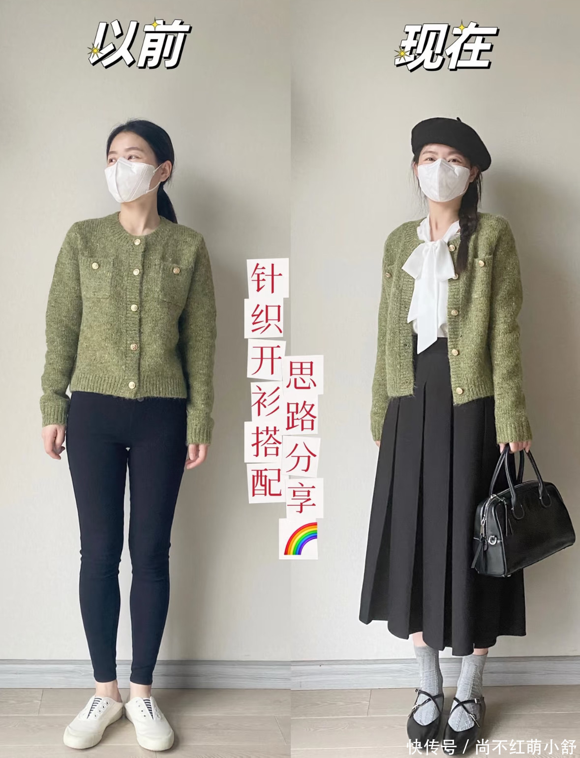 一件绿色针织开衫,内搭白色衬衫,露出飘带领口打造层次,下配高腰半裙修饰腿型,这样的穿搭,连肚子赘肉多,腿粗的梨型身材的姐妹也表示爱了~