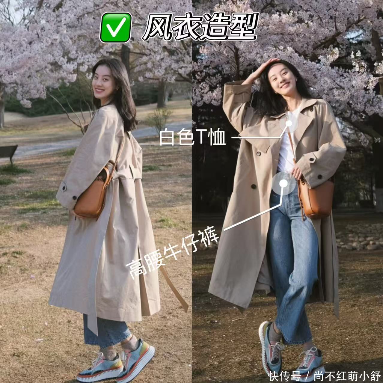 穿搭示范:浅色风衣内搭白色t恤+浅蓝牛仔高腰直筒裤,咖色的包包提亮色彩,这样的穿搭小个子显高也能穿出大气场。