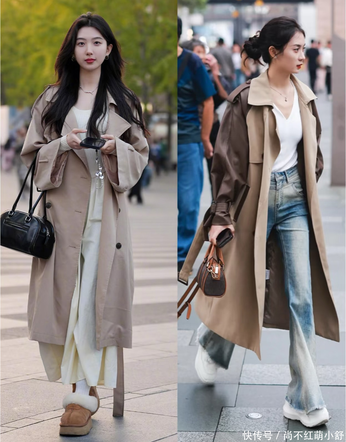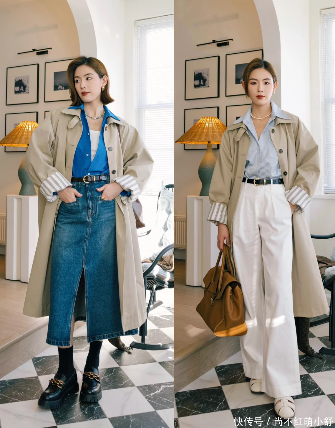 风衣版型中简约选择H型长款风衣,不仅百搭还包容性十分强,上海女性最常穿的是黑色、白色、咖色、卡其色等流行色系风衣,长度过膝10cm最佳,可搭配同色系腰带凸显腰线。
