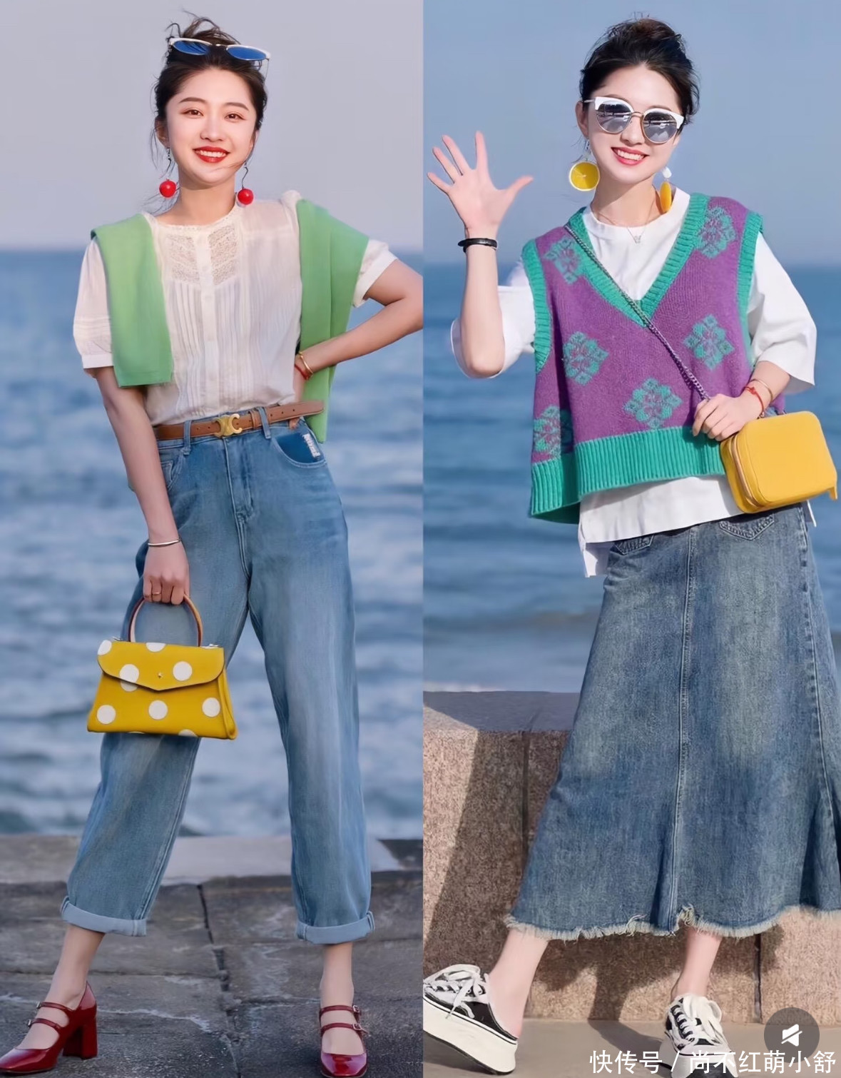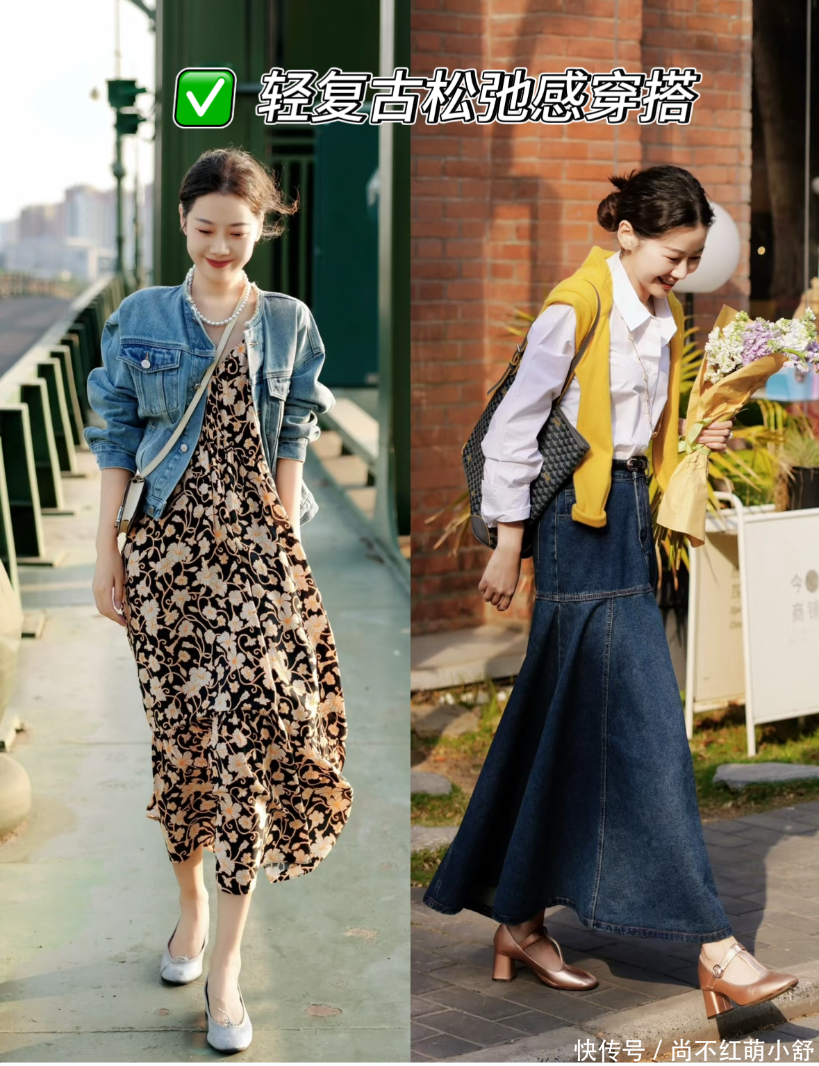 3、轻复古风松弛感穿搭示范:讲真,一条碎花裙+牛仔裤外套的轻复古风穿搭,重塑了80、90年代的港风,试问谁不爱呢?博主这样照穿,你也可以轻松穿出复古高级范。