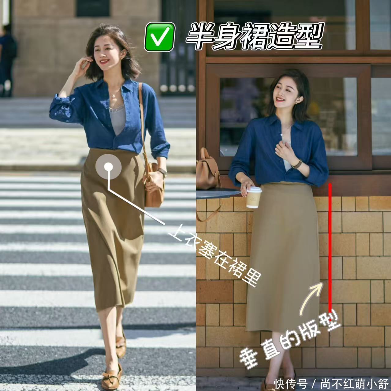 春季里女性的衣橱怎能少的了一条优雅的半身裙呢?不妨参考博主这样选择垂感面料,搭配短款牛仔上衣并且塞在裙子里拉长比例,这样的造型十分适合小腿纤细的女性。