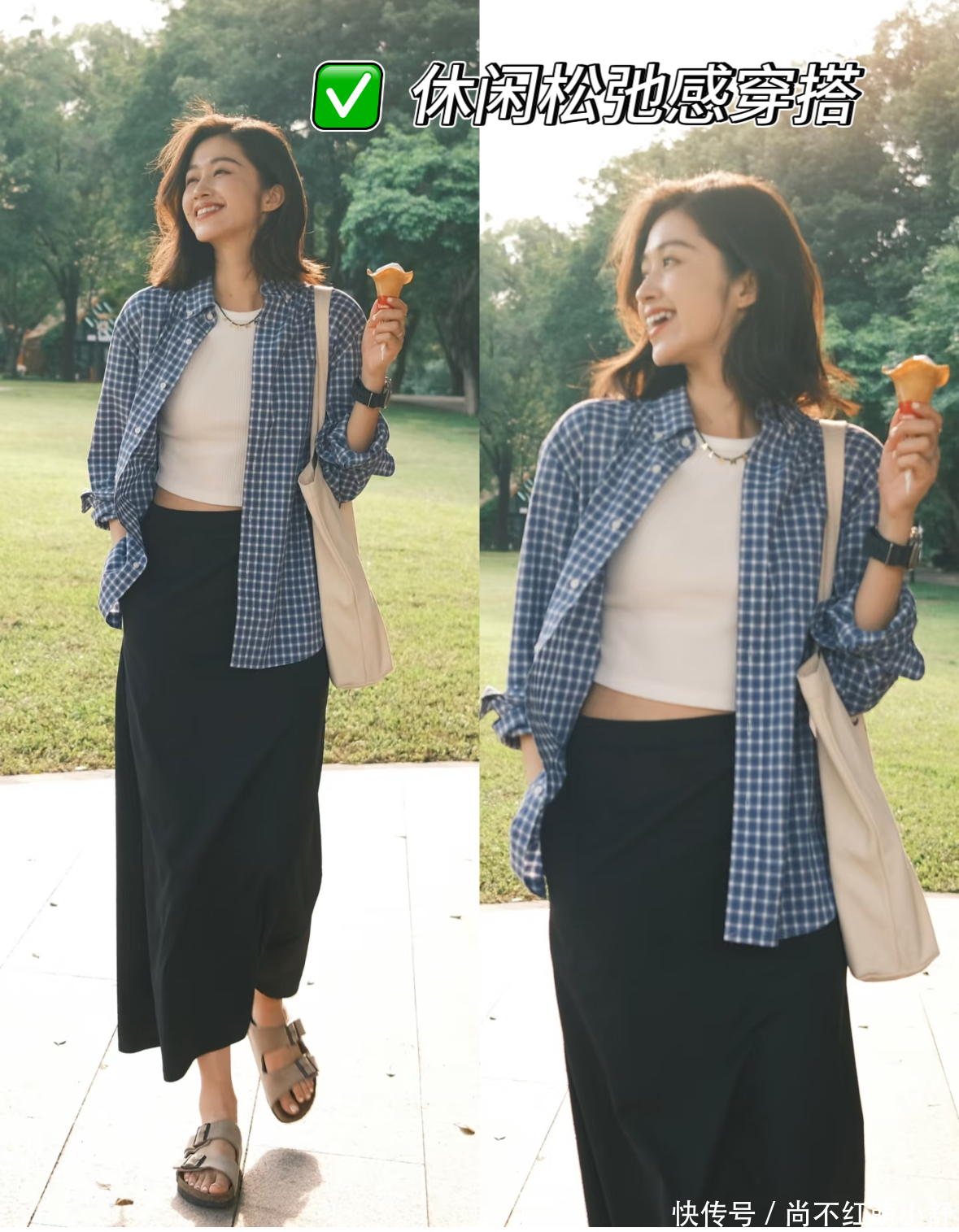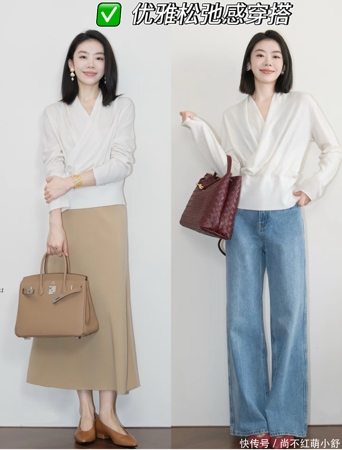 1、优雅松弛感穿搭示范:对于职场女性来说,优雅的松弛感是必备,一件衬衫搭配半身裙或牛仔裤就可以直接塑造出想要的优雅感,直接参考博主这样,既时髦又得体大方。